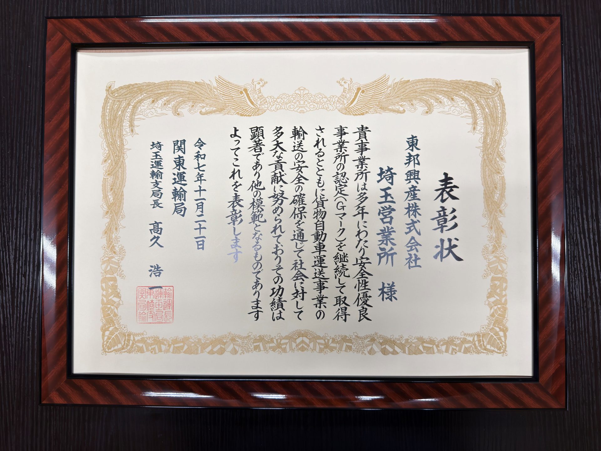 当社埼玉営業所は、「安全性優良事業所(Gマーク)」認定を継続取得し、表彰されました。今後も安全と品質の向上に努めてまいります。